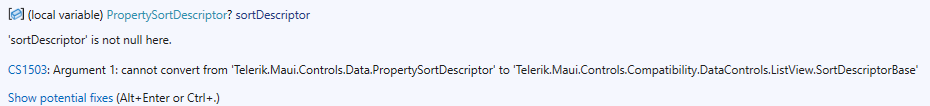 listView.SortDescriptors.Add(new Telerik.Maui.Controls.Compatibility.DataControls.ListView.SortDescriptorBase() { PropertyName = "PickupNumber", SortOrder = SortOrder.Ascending }); // Error, its a type and cannot be used to create an instance