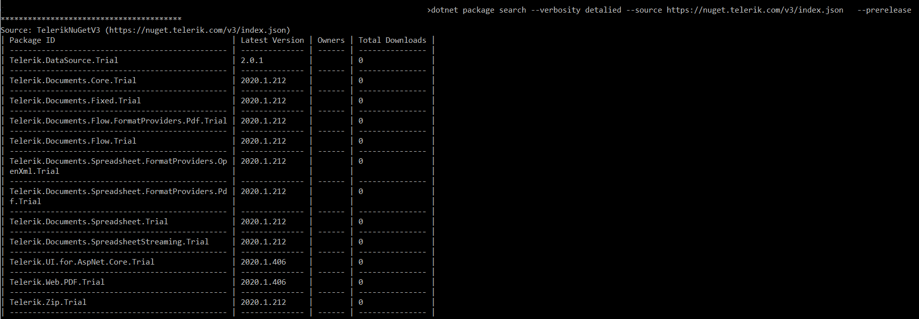dotnet package search --verbosity detalied --source https://nuget.telerik.com/v3/index.json --prerelease